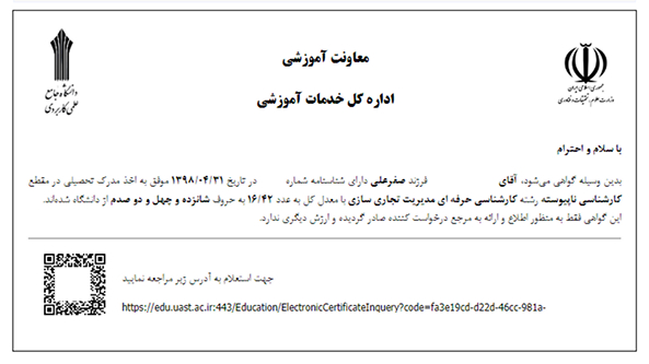 تمامی گواهی های موقت و دانشنامه های صادر شده از تاریخ ۱۹ آذر ۱۴۰۱ به بعد، در قسمت پاین صفحه دارای کد صحت ۲۰ رقمی و QR کد می باشند. این گروه از مدارک نیازی به استعلام از مرکز ندارند و در صورت نیاز جهت دریافت تاییدیه می توانند با مراجعه به سایت استعلام وزارت علوم و وارد نمودن کد صحت ۲۰ رقمی و یا اسکن QR کد ثبت شده بر روی گواهی موقت و یا دانشنامه، نسبت به دریافت تاییدیه تحصیلی اقدام نمایند.
